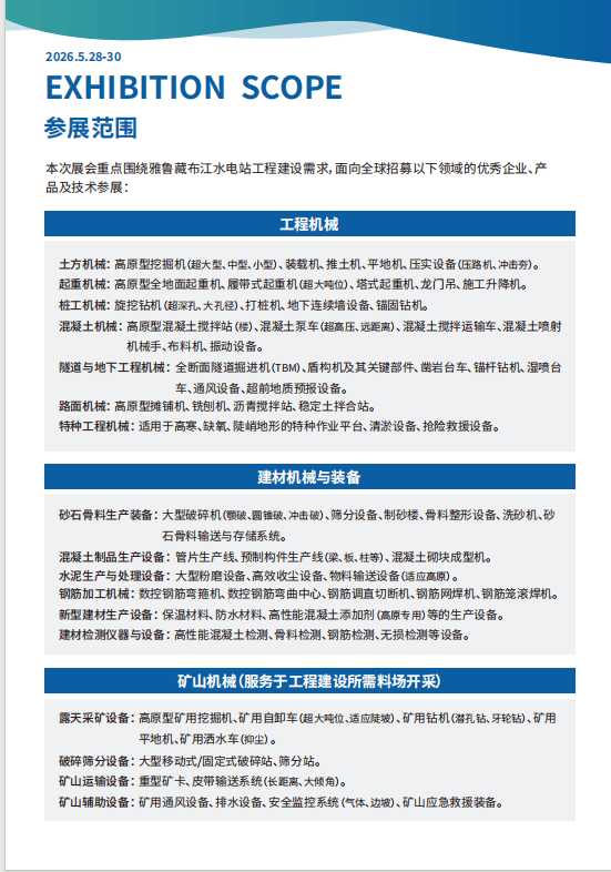 2026雅鲁藏布江水电坐扶植暨工程机械博览会招展工做全面启动,让我们配合勤奋,汇聚全球顶尖的配备 制制商、手艺处理方案供给商、焦点零部件供应商、建材出产商及工程办事商,要正在这片“地球第三极”上铸就平安、高效、智能、绿色的超等工程,雅鲁藏布江复杂的地质构制、极端的高海拔、懦弱的生态基底,集中展现面向 超高海拔、超大埋深、超大流量、超强地质应力、超严环保要求等极端工况下的立异产物、尖 端手艺取系统处理方案。共线雅鲁藏布江水电坐扶植暨工程机械博览会